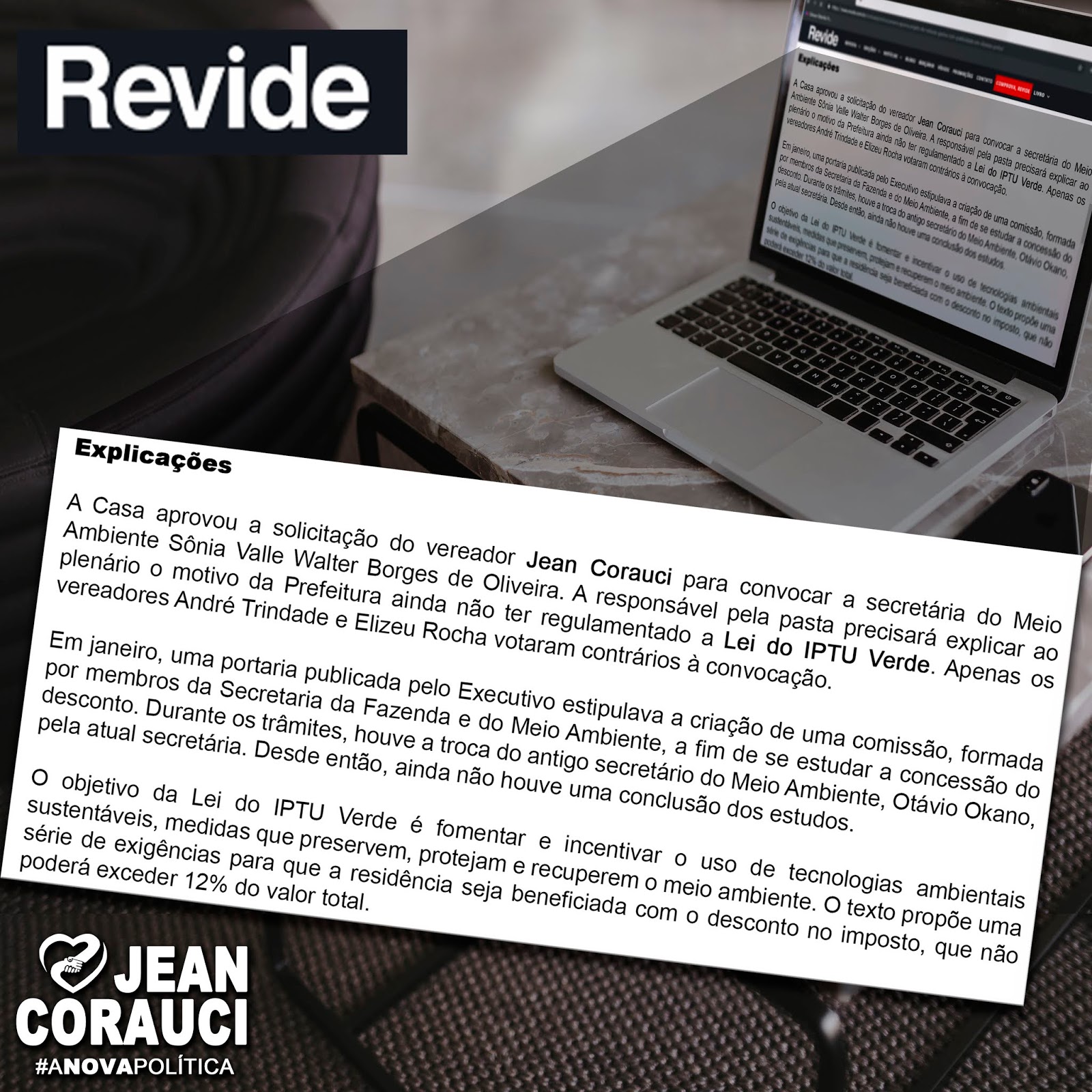 A Câmara aprovou a solicitação do vereador Jean Corauci para convocar a secretária do Meio Ambiente Sônia Valle Walter Borges de Oliveira. A responsável pela pasta precisará explicar ao plenário o motivo da Prefeitura ainda não ter regulamentado a Lei do IPTU Verde. Apenas os vereadores André Trindade (DEM) e Elizeu Rocha (PP) votaram contrários à convocação.